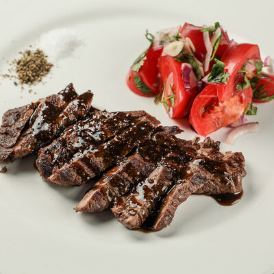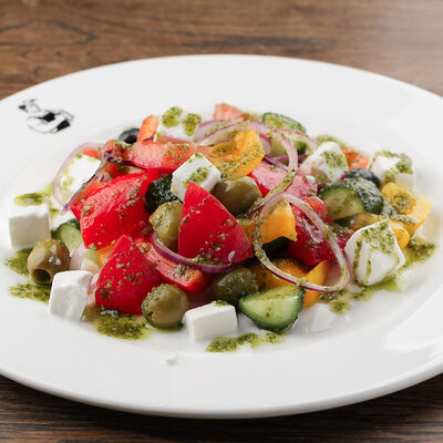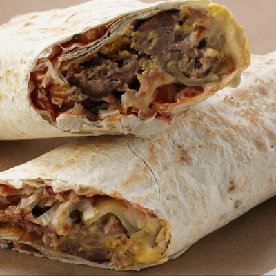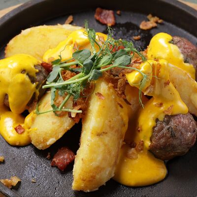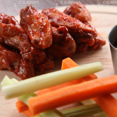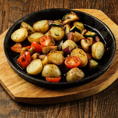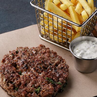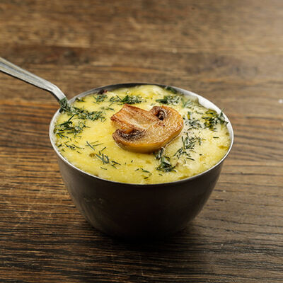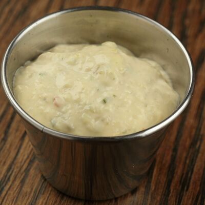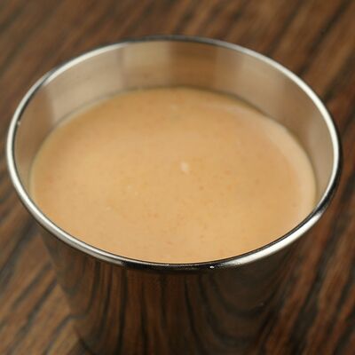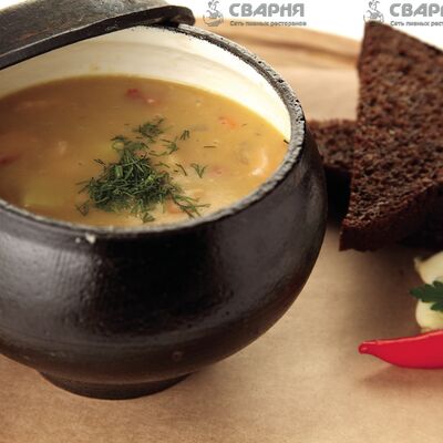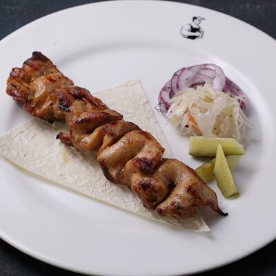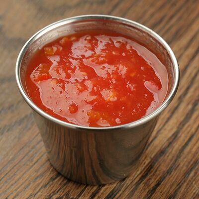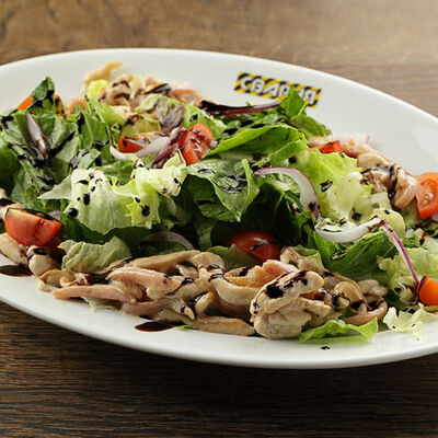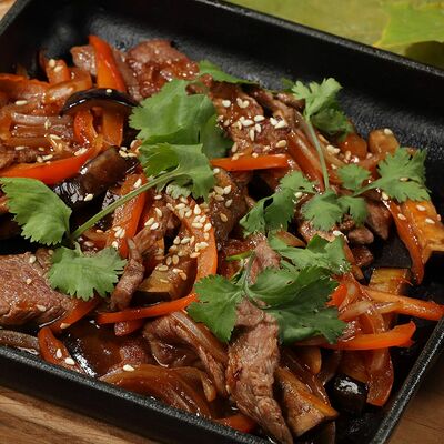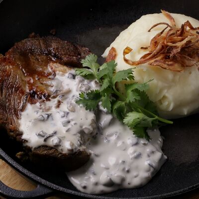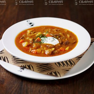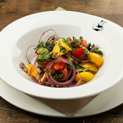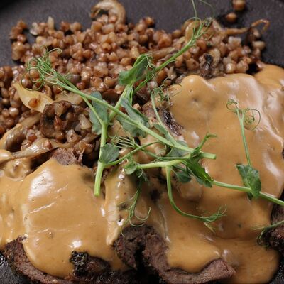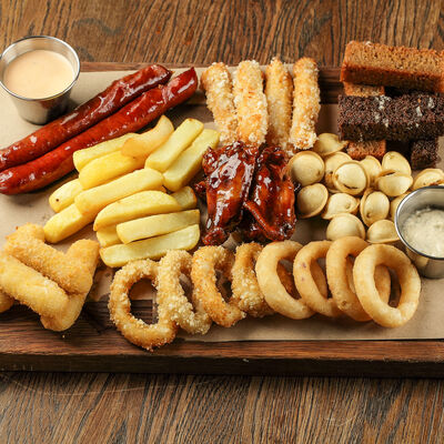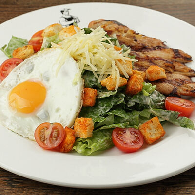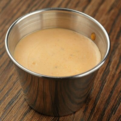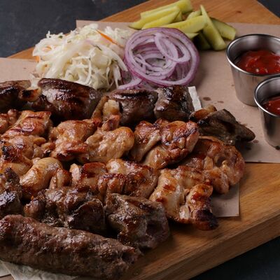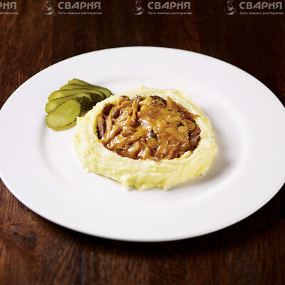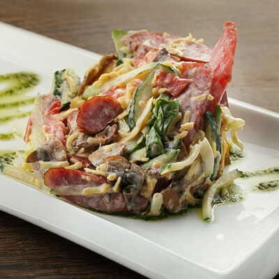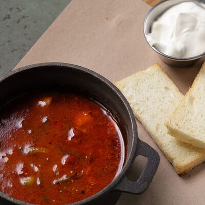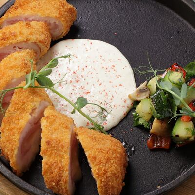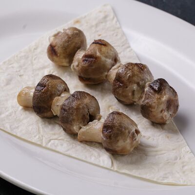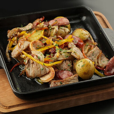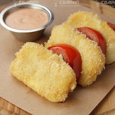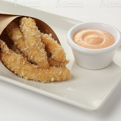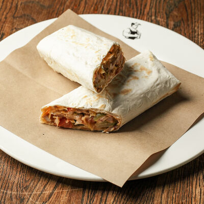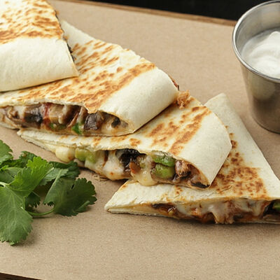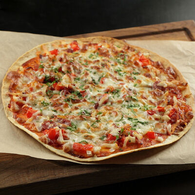 Куриное филе, шампиньоны, соус сальса и соус из печеных перцев, сыр гауда. Подается со сметаной