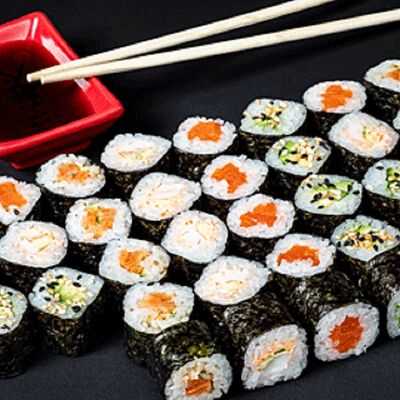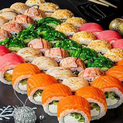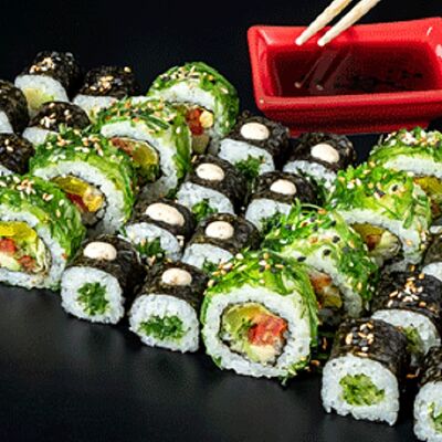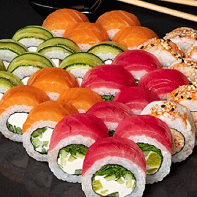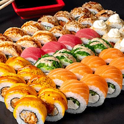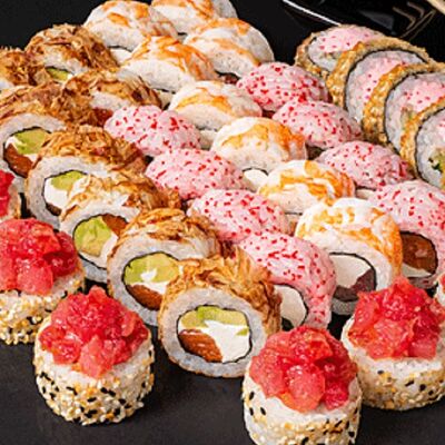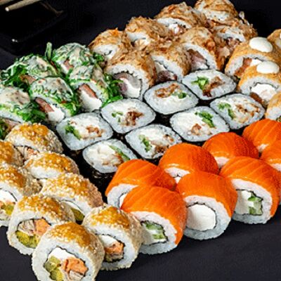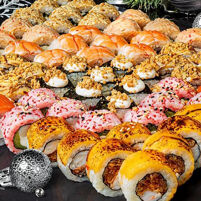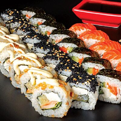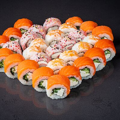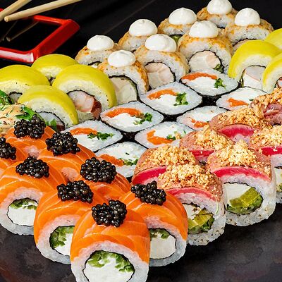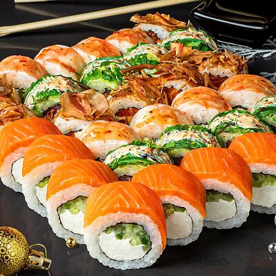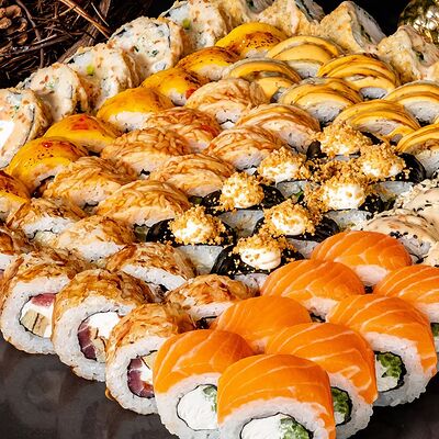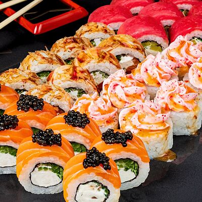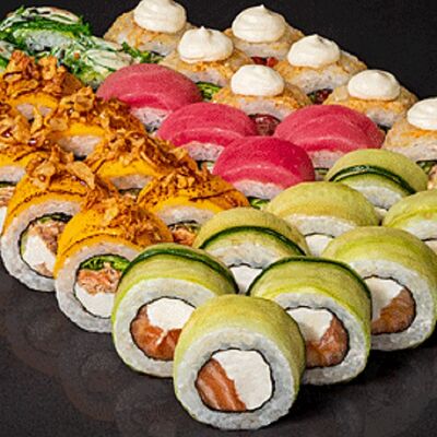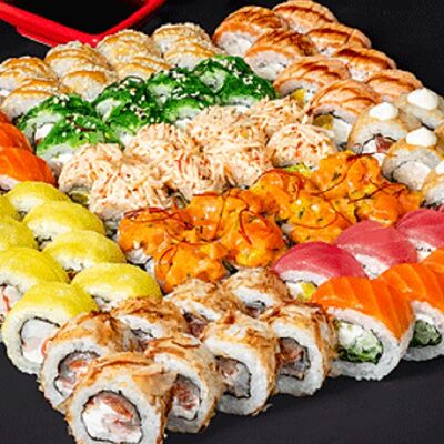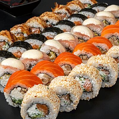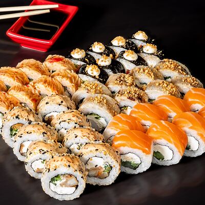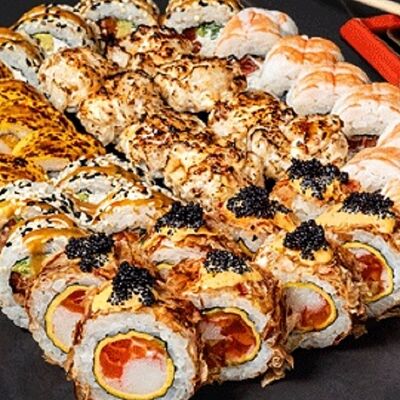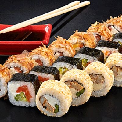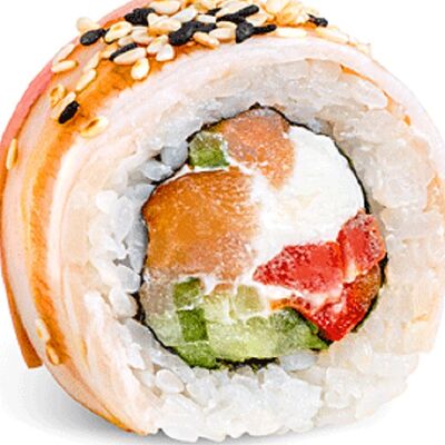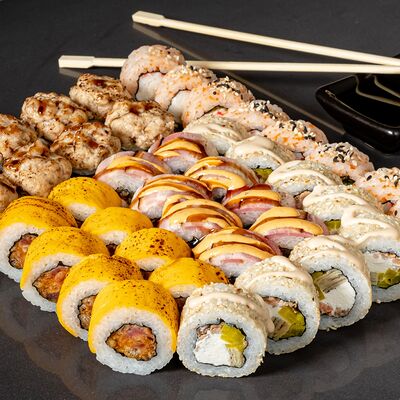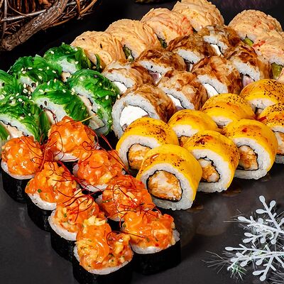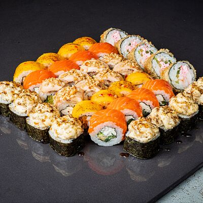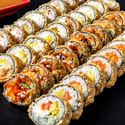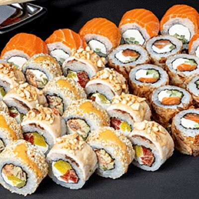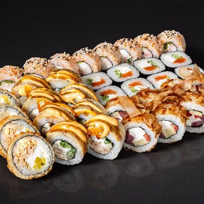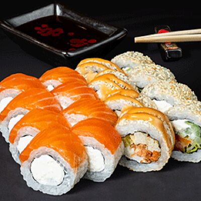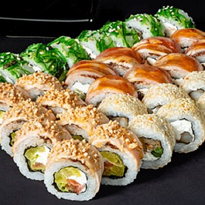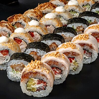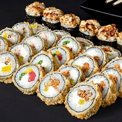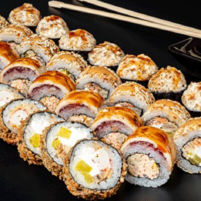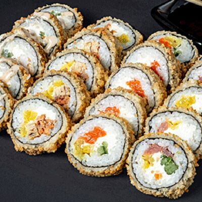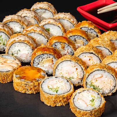 Манчестер-жареное филе лосося, такуан, сливочный сыр, омлет Тамаго, соус Лос-Анджелес, кунжут (8 шт.), Мичиган Фрай-сурими, сливочный сыр, омлет Тамаго, такуан, острый соус, панировка. Острое (5 шт.). Чикаго-цыпленок гриль, сливочный сыр, омлет Тамаго, икра Тобико оранжевая, ростки сои, луковый мармелад, соус BBQ (8 шт.), Хот сити-жареный морской окунь, сливочный сыр, огурец, омлет Тамаго, сырный соус, нори, соус Терияки (8 шт.)