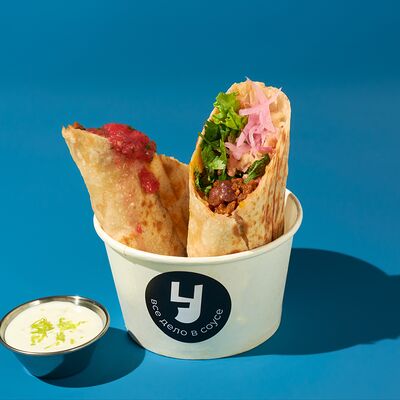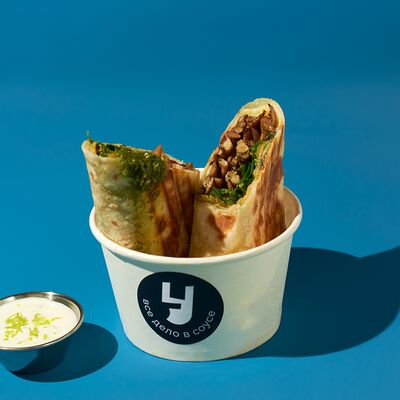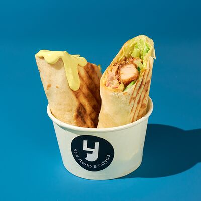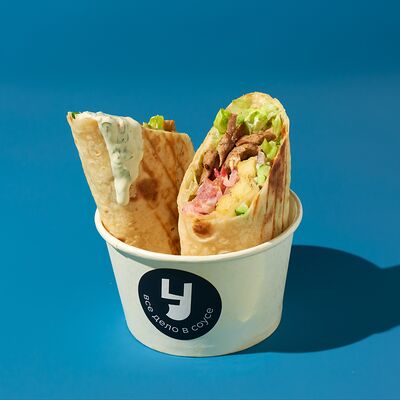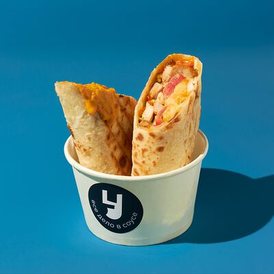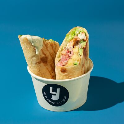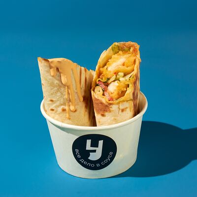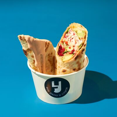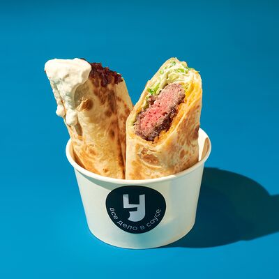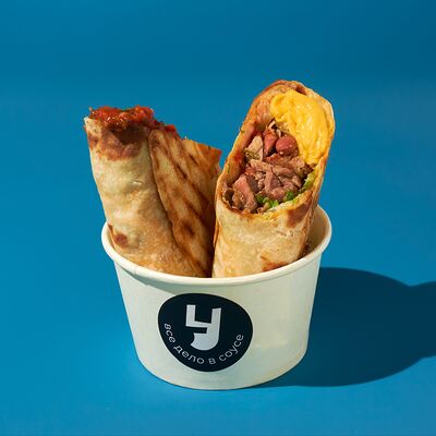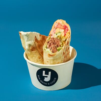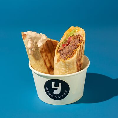 Домашняя лепешка пшеничная, телятина гриль, фасоль красная, лук красный маринованный, огурец маринованный, сыр сулугуни, салат айсберг, острая сальса с чили, соус кимчи