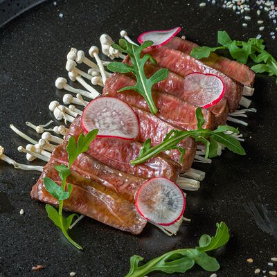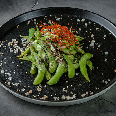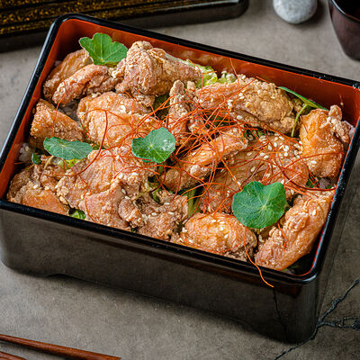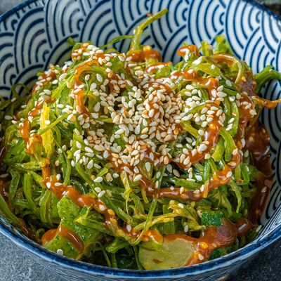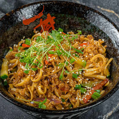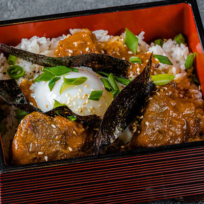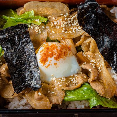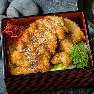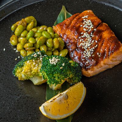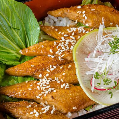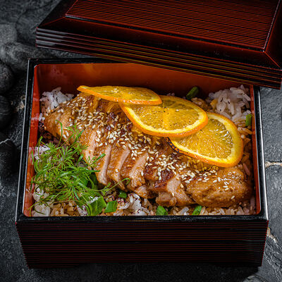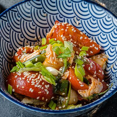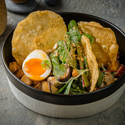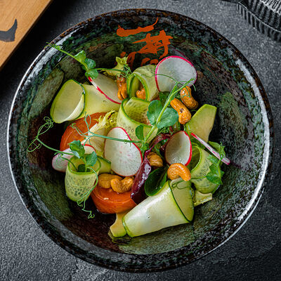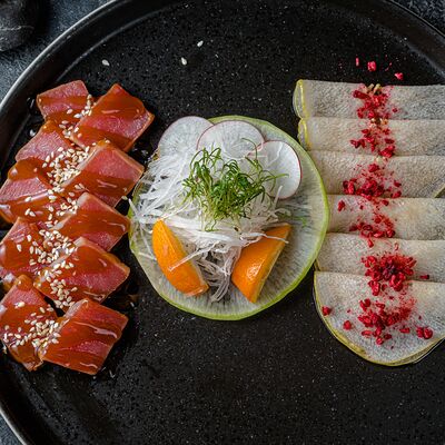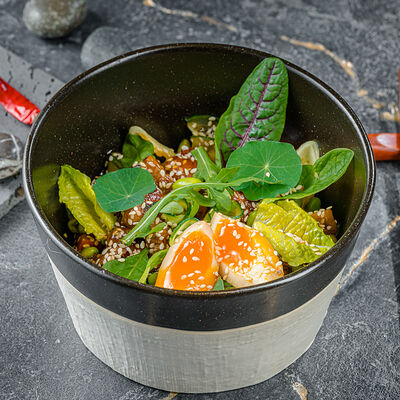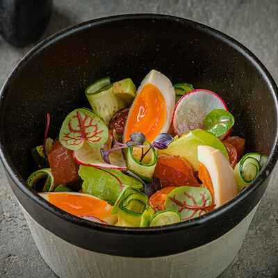 Тёплый рис с тунцом, авокадо, цукини, томатами черри, огурцами, эдамаме, яйцом нитамаго, микрозеленью, редисом, кунжутом и цитрусово-медовым соусом