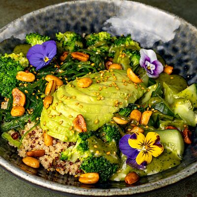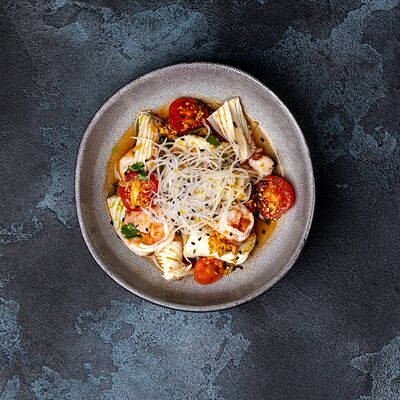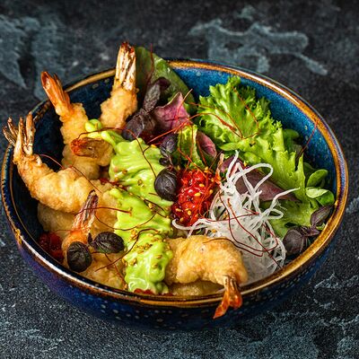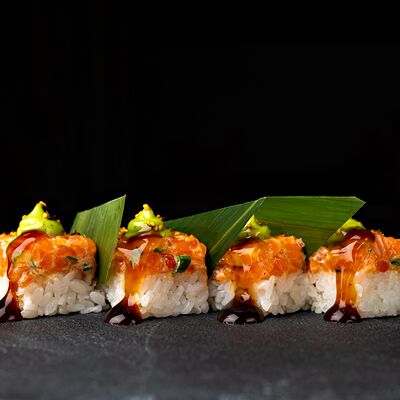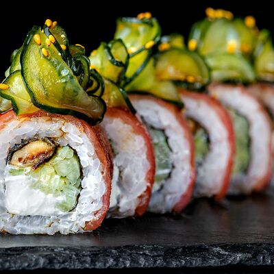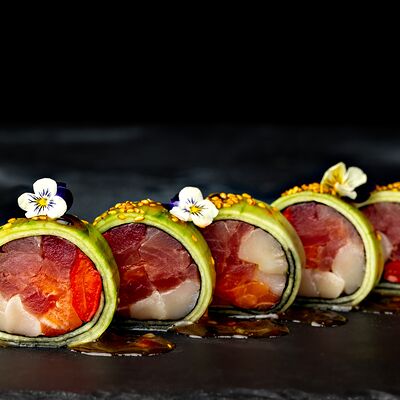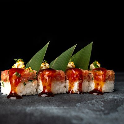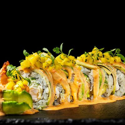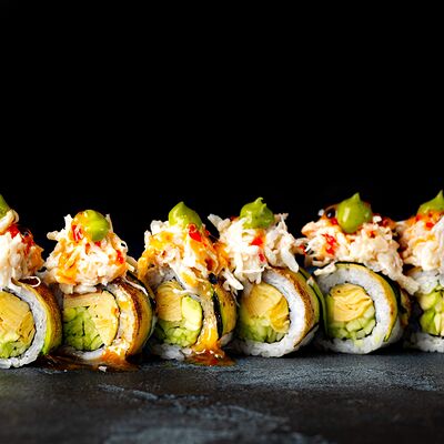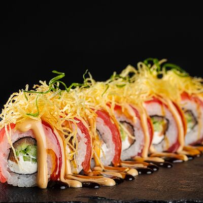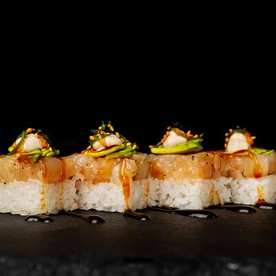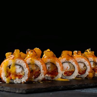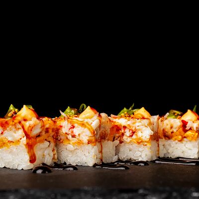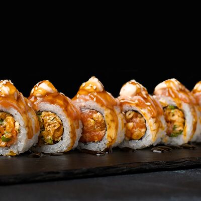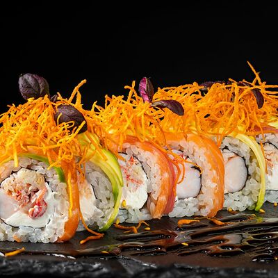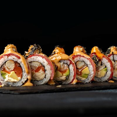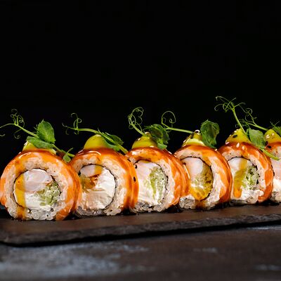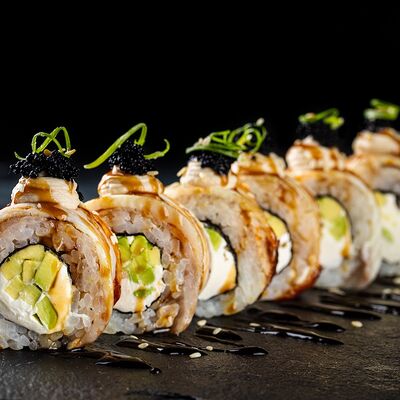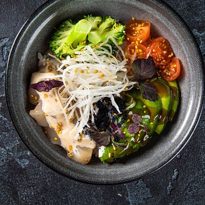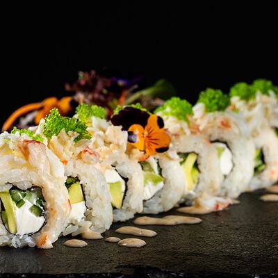 Рис, гребешок, соус трюфельный майо, терияки, томаты черри, авокадо, брокколи, тобико, цума дайкон, кунжут юдзу, черная икра тобико