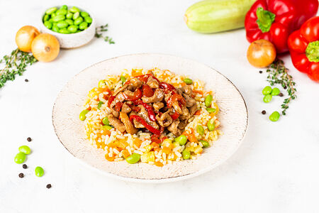 Яркое блюдо в азиатском стиле. Вкуснейшая нежная свинина с ароматным пряным соусом Терияки и идеальным гарниром из круглозерного риса с суперполезными бобами Эдамаме.