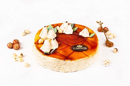 Превосходное сочетание карамельного бисквита пропитанного варёным сгущенным молоком и легкого крема на основе взбитых сливок с варёной сгущёнкои. Торт украшен отборными финиками и бутонами тюльпанов из взбитых сливок.