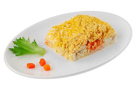 Любимый салат с пониженным содержанием калорий. Чтобы чаще радовать себя и своих близких вкуснейшим салатом, не беспокоясь о стройности, мы изменили традиционную рецептуру. Наша Мимоза менее калорийна по сравнению с классической, поскольку в ней нет сливочного масла. Только свежие ингредиенты, майонез собственного производства, нежная рыба - секрет потрясающего вкуса слоеного салата по рецепту нашего шеф-повара.
