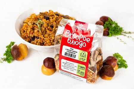 Настоящий вегетарианский плов с белыми грибами, рассыпчатым рисом, сочным изюмом и овощами. Идеальное сочетание натуральных компонентов с пользой для здоровья. Вкусное горячее блюдо с первого раза быстро и легко! Удобная инструкция, минимум дополнительных ингредиентов: вода, соль, сливочное масло, свежерубленная зелень петрушки и/или кинзы по вкусу.