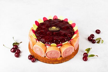 Основа торта - классический бисквит, промазан вишневой начинкой, боковые стороны оформлены бисквитными рулетами с клубничным вареньем, пропитан сахарным сиропом с ликером. Бисквитная корзина наполнена воздушным кремом из взбитых сливок с ароматной вишней. Торт украшен отборной вишней и лепестками из горького шоколада собственного производства.