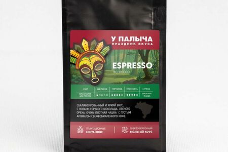 Эспрессо ТМ У Палыча обладает полнотелым вкусом, в котором ноты горького шоколада и лесного ореха и богатым ароматом свежеобжаренного кофе. В составе этого напитка 60% Арабики и 40% Робусты. Арабика придает чашке плотный вкус и аромат, а Робуста крепость и плотную пену. Вкус этого кофе сбалансированный, яркий непременно понравится Вам.