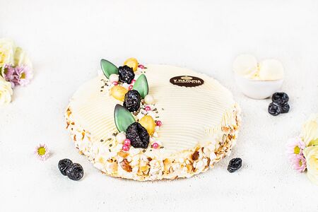 Торт состоит из двух слоев воздушного безе, промазанных сливочно-заварным кремом с добавлением сливочного мороженого, кусочков разваренного чернослива, измельченного фундукаи грецкого ореха. Торт покрыт нежнымсливочно-заварным кремом с мороженым. Боковая поверхность украшена крошкой воздушного безе и миндальными лепестками.Сверху композиция из вкуснейшего чернослива, миндаля в шоколаде и шоколадных лепестков из элитного темного шоколада.