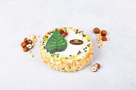 Вкус знакомый с детства. Классический бисквит с арахисом, прослоенный сливочным кремом с дробленым арахисом, пропитанного сахарным сиропом с добавлением коньяка. Боковые стороны украшены дробленым арахисом, поверхность покрыта сливочным кремом и украшена сливочно-шоколадным кремом и фундуком. Пищевая ценность в 100 г продукта (среднее значение на 100 г продукта): белки - 8,5 г; жиры 32,4 г; углеводы — 42,7 г Энергетическая ценность: 496 ккал / 2078 кДж