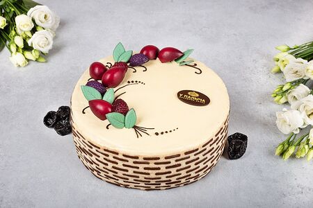 Сочетание трех мягких песочных коржей на сметане, сливочного суфле с натуральным сгущенным молоком без заменителей молочных жирови сливочно-заварного крема с нежным разваренным черносливом и спелой сливой. Торт покрыт сливочным кремом и украшен веточкой с ягодами из настоящего темного шоколада и натуральнымчерносливом. Боковые стороны оформлены нежным рулетным бисквитом с узнаваемым рисунком.