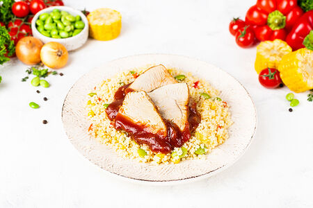 Богатая белком запеченная индейка в сочетани с полезным кускусом из твердых сортов пшеницы, овощами и суперполезными бобами Эдамаме.