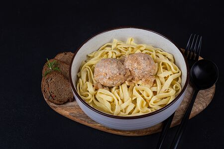 Нежное и сытное мясное блюдо. Для биточков составляется специальный фарш так, мы получаем очень мягкий вкус. Мясные шарики томятся в томатном соусе со сметаной. Для пасты собственного приготовления подбирается мука особого сорта и используется такая технология приготовления, благодаря которой паста не подсыхает в процессе хранения и сохраняет вкус свежесваренной пасты.