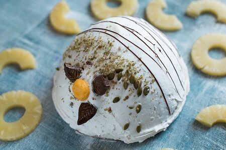 Великолепное сочетание белого и шоколадного бисквита, крема из натуральной сметаны и взбитых сливок, изобилие начинки из ананаса и отборного грецкого ореха. Торт в виде полусферы, украшен композицией ручной работы из шоколада собственного производства и семенами тыквы.