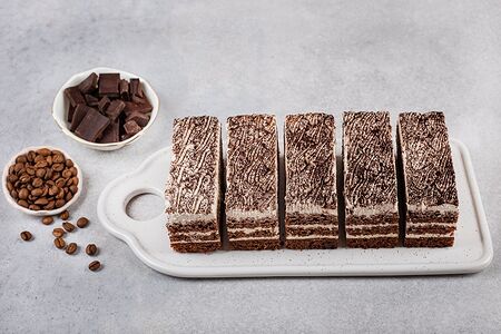 Пирожное состоит из трёх нежных шоколадных бисквитов на сметане пропитанных сахарным сиропом с добавлением натурального молотого кофе. Пирожное прослоено и украшено нежным кремом на основе творожного сыра с добавлением взбитых сливок. Пирожное посыпано какао тончайшего помола. Это сочное нежное пирожное для истинных любителей сливок и кофе.