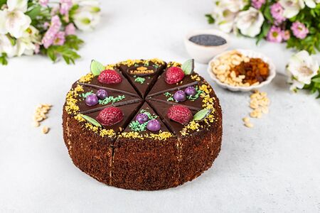 Изумительный торт, из трех видов белого бисквита с маком, с арахис и изюмом. Бисквит пропитан сахарным сиропом с добавлением ликера, каждый слой промазанны сливочным кремом. Торт порционный, боковые стороны украшены шоколадной крошкой, поверхность залита шоколадной помадкой и украшена ягодками и листиками из темного шоколада.