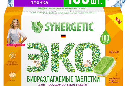 Таблетки для посудомоечных машин бесфосфатные Synergetic, без запаха, 100 шт доставка