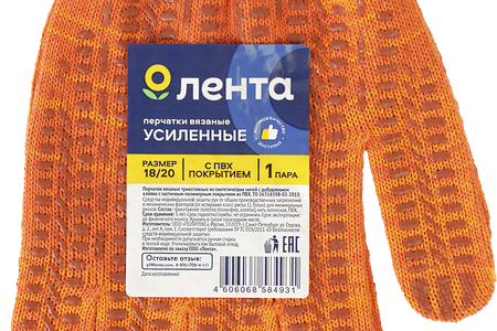 Перчатки вязаные усиленные ЛЕНТА с двухсторонним ПВХ покрытием, р.18/20, 5 нитей, класс 10, оранжевые доставка