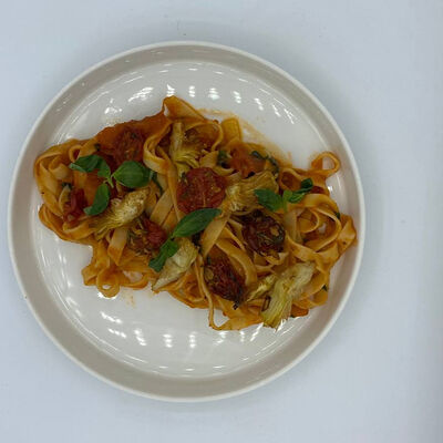 Томатный соус, паста тальятелле, печеные томаты, томаты черри, базилик свежий, артишоки, чеснок очищенный, оливковое масло