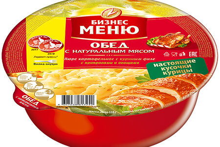 Бизнес меню это разнообразные обеды и готовые блюда быстрого приготовления, разработанные на основе натуральных ингредиентов и высококачественного сырья: яичная лапша высшего сорта, отборное картофельное пюре, мясные соусы и мясорастительные консервы с аппетитными кусочками натурального мяса.