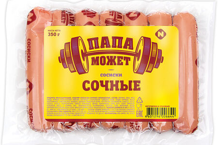 Сосиски Папа Может Сочные 350г приготовлены по рецептуре Останкинского мясоперерабатывающего завода из свинины, мяса птицы и филе куриных грудок с добавлением ароматных пряностей. Сосиски - это простое и сытное блюдо для быстрого обеда или ужина. Продукция бренда "Папа может" производится на новейшем оборудовании из Германии и Австрии, в качестве сырья используется охлажденное мясо и натуральные специи, копчение происходит на натуральной щепе лиственных деревьев. Упакованы в защитной атмосфере.