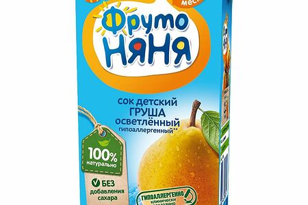 Осветленный сок Фруто Няня Груша. Грушевый сок содержит пектин в большом количестве. Особенно рекомендуется его применение при проблемах с почками. Выводит лишнюю воду, усиливает перистальтику кишечника, выводит шлаки и токсины. Рекомендуется детям с 3 месяцев, начиная с минимальной дозы после одного из утренних кормлений, постепенно увеличивая в течение 5-7 дней до 20-30 мл.