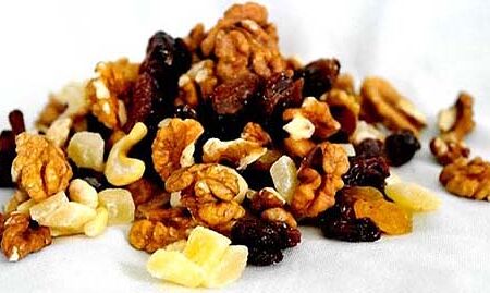 цукаты ананаса, изюм, жареные ядра орехов арахиса, миндаля, фундука, кешью