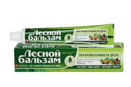 Зубная паста обладает выраженным кровоостанавливающим действием. В состав зубной пасты при кровоточивости десен входит хвойный комплекс с экстрактами коры дуба и пихты, отваром трав, что способствует укреплению кровеносных сосудов десен, улучшает кровообращение и питание мягких тканей полости рта, препятствует повторному возникновению кровоточивости при чистке зубов. Зубная паста при кровоточивости десен Лесной бальзам рекомендована стоматологами для ежедневного использования при легких и хронических формах гингивита и пародонтита¹: 1) Эффективна с первого применения¹. 2) В 2 раза снижает кровоточивость десен². 3) Безопасна для микрофлоры полости рта³. ¹Эффективность продукта подтверждена в ходе клинических испытаний, Россия 2013. ²На 14-ый день использования в сравнении с начальным состоянием полости рта, согласно клиническим испытаниям, Россия 2013. ³Сохраняет баланс естественной микрофлоры полости рта при длительном использовании, согласно клиническим и микробиологическим испытаниям, Россия 2016. Не являет