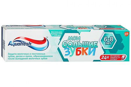 Зубная паста Aquafresh Мои большие зубки – это мягкая пенящаяся зубная паста, специально разработанная для детей в возрасте 6 до 8 лет. В ее состав входит технология Активная защита от сахара, основанная на фторе, которая помогает укреплять эмаль и защищает от кариеса не только молочные, но и новые постоянные зубы. Для всесторонней защиты дети могут также использовать привлекательные зубные щетки Мои большие зубки.