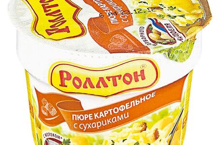 Бренд «Роллтон» – лидер рынка картофельного пюре. Картофельное пюре от «Роллтон» создано в соответствии с лучшими традициями и вкусовыми предпочтениями потребителей из самых высококачественных ингредиентов. Оно обладает нежным вкусом и приятным ароматом. При производстве используются только отборные хлопья из натурального картофеля. Аппетитное пюре можно приготовить за 5 минут – необходимо всего лишь залить содержимое стакана кипятком, перемешать и можно приступать к еде!.