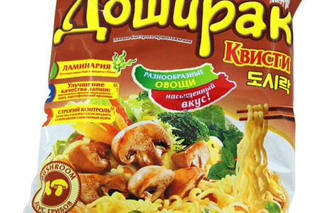 Лапша Доширак Квисти представляет собой индивидуальную порцию быстроразваривающейся лапши из высококачественной пшеничной муки в мягком пакете. В упаковке также содержатся пакетик вкусового бульона с приправой, содержащий все необходимые специи и пряности, лук и чеснок, придающие лапше неповторимый вкус и аромат; а также пакетик с сушеными овощами – вы можете дозировать приправы по своему вкусу!.