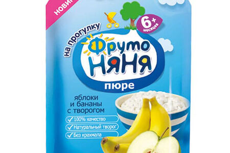 Пюре яблочно-банановое с творогом и сахаром для питания детей раннего возраста..