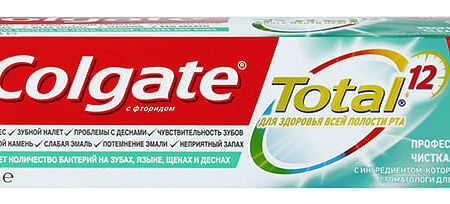 Для того, чтобы быть уверенным в своей яркой улыбке, начните со здоровья всей полости рта. Новый Colgate Total 12 Профессиональная Чистка (гель) содержит специальный ингредиент, который используется стоматологами для гладких и блестящих зубов надолго.Теперь Colgate Total не только борется с бактериями на зубах, но и на языке, щеках и деснах и защищает их в течение 12 часов*