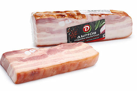 Грудинка Дымов Крылатская копчено-вареная приготовлена по эксклюзивному рецепту из отборной нежной свинины с добавлением пряных специй. Имеет приятный дымный аромат натурального копчения. Вся продукция Дымовского колбасного завода производится из натуральных ингредиентов и не содержит ГМО. Тщательный отбор сырья и контроль на всех стадиях производства позволяют создавать мясные деликатесы высокого качества. Вакуумная упаковка наилучшим образом сохраняет вкусовые и питательные свойства в течение всего срока годности.