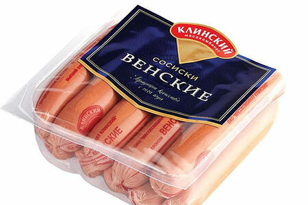 Сосиски Клинский Венские - охлажденные колбасные изделия, приготовленные из свинины и говядины с добавлением пряностей. Рекомендуется употреблять в горячем виде (варить в кипящей воде 4 минуты). Вся продукция Клинского мясоперерабатывающего комбината проходит тщательный контроль качества на всех этапах производства, готовится из отборных натуральных ингредиентов по рецептам ГОСТ или авторским рецептам местных технологов. Продукт упакован с использованием модифицированной атмосферы, что позволяет сохранить питательные и вкусовые качества в течение всего срока годности. Каждая сосиска - в целлофановой оболочке.