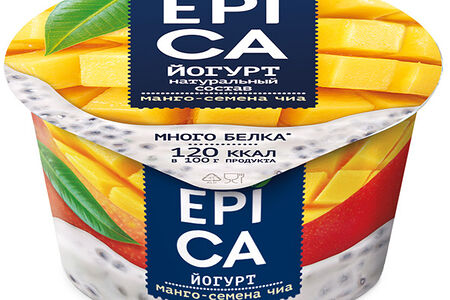 Йогурт Epica с манго и семенами чиа 5% 130г - это новый кисломолочный продукт с высоким содержанием белка от компании Ehrmann, приготовленный на 100% из натуральных ингредиентов. В его состав входит молоко с ближайших к заводу фермерских хозяйств, сливки, йогуртовая закваска, пробиотические культуры, манговый наполнитель и кладезь полезных веществ - уникальные семена чиа. Благодаря увеличенному количеству белка йогурт Epica быстро и надолго насыщает, его можно употреблять в качестве здорового и полезного перекуса. Упакован в стерильный пластиковый стаканчик с фольгированной крышкой..