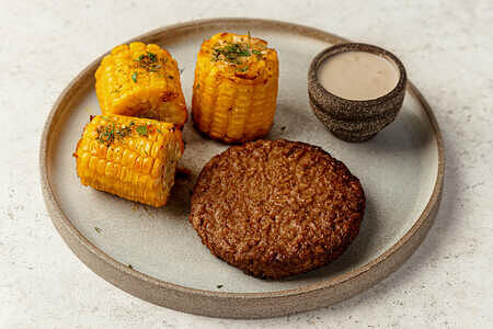 Кукуруза гриль с не мясной котлетой Hi и соусом доставка