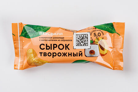 Сведения о составе: творог (молоко обезжиренное, закваска, молокосвертывающий ферментный препарат животного происхождения), сахар, шоколад молочный (сахар, какао масло, молоко цельное сухое , какао тертое, эмульгатор - лецитины (соевый), ванильный экстракт), масло сливочное "Крестьянское" массовая доля жира 72,5%, наполнитель фруктовый "Абрикосовый" (сахар, вода питьевая, абрикос быстрозамороженный, абрикос сушеный (курага), патока крахмальная, яблочное пюре, загуститель - пектины (цитрусовый), концентрированный сок лимона, натуральный ароматизатор "Абрикос", красители (экстракт паприки, каротины (бета-каротин)).Пищевая ценность: белки 14 г; жиры 11 г; углеводы 33 г; 287 ккал
