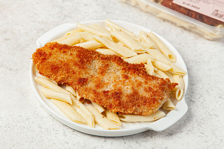 Шницель куриный в сырной панировке с макаронами доставка