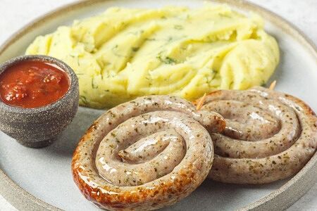 Колбаска Баварская 2 шт. на шпажке с картофельным пюре доставка