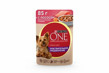 Влажный корм Purina ONE Мини Чувствительное пищеварение для взрослых собак мелких пород с чувствительным пищеварением, с лососем, рисом и морковью в подливе 85 г доставка