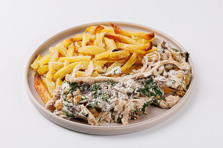 Картофель жареный со свининой и грибами в сметанном соусе доставка