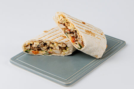 Сэндвич ролл с курицей, вешенками и соусом том ям на гриле, кафе доставка