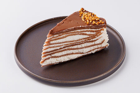 Сведения о составе: блины (молоко питьевое м.д.ж. 3,2%, мука пшеничная хлебопекарная высшего сорта, меланж яичный жидкий, сахар, масло сладко-сливочное несолёное м.д.ж. 82,5 %, кака-порошок), крем (крем сливочный м.д.ж. 33% (сливки нормализованные, стабилизатор – каррагинан), сыр творожный сливочный м.д.ж. в сухом веществе 72% (творог (молоко обезжиренное, сливки, молочный белок, фермент молокосвёртывающий микробного происхождения, закваска молочнокислых мезофильно-термофильных культур), молочная сыворотка подсырная, сливки, соль пищевая, желатин пищевой), сахарная пудра, экстракт ванили), глазурь (крем сливочный м.д.ж. 33% (сливки нормализованные, стабилизатор – каррагинан), шоколад (какао-тертое, сахар, какао-масло, эмульгатор - лецитины (подсолнечный), ароматизатор натуральный – ваниль)), посыпка (рис шлифованный дроблёный, сахар, глюкозный сироп, жжёный сахар, масло подсолнечное рафинированное высокоолеиновое, мёд натуральный цветочный). Продукция производится на предприятии, где используются аллергены: арахис, орехи.Пищевая ценность: белки 5,6 г; жиры 19,7 г; углеводы 28,3 г; 312,9 ккал