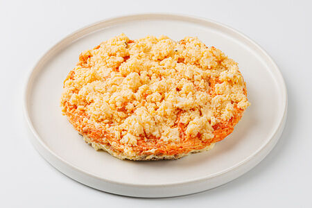 Сведения о составе: печень индейки жареная (печень индейки замороженная, лук репчатый свежий, бульон из индейки процеженный (вода питьевая, суповой набор из индейки замороженный (мясокостные части тушки индейки), лук репчатый свежий, морковь столовая свежая, соль пищевая, зелень укропа свежая, чеснок свежий, лавровый лист, перец чёрный горошек, чеснок сушёный гранулированный, перец душистый горошек), масло подсолнечное рафинированное дезодорированное, соль пищевая), морковь отварная тёртая, картофель отварной тёртый, меланж яичный жареный (меланж яичный жидкий пастеризованный, масло подсолнечное рафинированное дезодорированное, соль пищевая), майонез «Провансаль» м.д.ж. 67% (масло подсолнечное рафинированное дезодорированное, вода питьевая, сахар, яичный желток жидкий, соль пищевая, уксус спиртовой 20%, масло горчичное нерафинированное), сыр «моцарелла» м.д.ж. в сухом веществе 45% (молоко пастеризованное высшего сорта, соль пищевая, термофильные бактериальные закваски, молокосвёртывающий ферментный препарат микробиального происхождения), соль пищевая. Продукция производится на предприятии, где используются аллергены: арахис, злаки, содержащие глютен, кунжут, ракообразные, рыба, орехи, сельдерей, соя.Пищевая ценность: белки 7 г; жиры 17,1 г; углеводы 5,3 г; 203,1 ккал