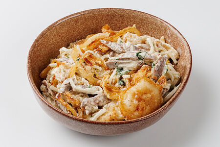 Сведения о составе: Дайкон свежий, майонез м.д.ж. 67% (масло подсолнечное рафинированное дезодорированное, вода питьевая, сахар, яичный желток жидкий, соль пищевая, уксус спиртовой 20%, масло горчичное нерафинированное), лук репчатый жареный (лук репчатый свежий, мука пшеничная хлебопекарная высшего сорта, масло подсолнечное рафинированное дезодорированное, соль пищевая), говядина отварная (произведено из мороженого сырья), соль пищевая, кориандр свежий (кинза) (зелень). Продукция производится на предприятии, где используются аллергены: арахис, кунжут, моллюски, ракообразные, рыба, молоко (лактоза), орехи, сельдерей, соя.Пищевая ценность: белки 5,9 г; жиры 23,6 г; углеводы 10,3 г; 277,2 ккал