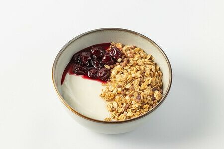 Сведения о составе: Йогурт греческий (молоко нормализованное (молоко цельное, молоко обезжиренное), йогуртовая закваска), гранола "Кранч ржаной" (хлопья ржаные, мёд натуральный подсолнечный, семена подсолнечника, мякоть ореха кокосового (стружка), семена кунжута, ядра кешью сырые, ананас сушёный, виноград сушёный, сироп из топинамбура, клюква сушёная, масло подсолнечное рафинированное дезодорированное, сок яблочный (100%-й натуральный сок прямого отжима), соль морская, кардамон, орех мускатный), соус Брусничный (клюква замороженная, вода питьевая,мед натуральный цветочный, брусника замороженная, сахар, уксус винный красный 6%, крахмал кукурузный, соль пищевая, корица молотая), варенье вишневое (вишня свежая или быстрозамороженная, сахар).Пищевая ценность: белки 8,5 г; жиры 9,03 г; углеводы 12,35 г; 161 ккал