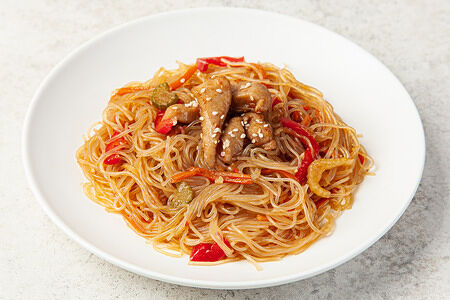 Фунчоза с курицей и овощами в сладком соусе чили доставка