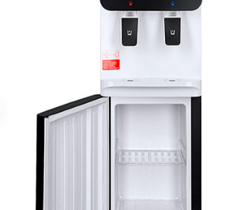 Компактный кулер для воды с функциями нагрева и охлаждения. С небольшим шкафчиком в нижней части. Электронное охлаждение. Корпус черного цвета с белой вставкой в области кранов подачи воды. Индикация режимов нагрева, охлаждения и готовности воды. Краны «нажим кружкой».