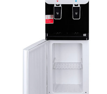 Компактный кулер для воды с функциями нагрева и охлаждения. С небольшим шкафчиком в нижней части. Электронное охлаждение. Корпус белого цвета с черной вставкой в области кранов подачи воды. Индикация режимов нагрева, охлаждения и готовности воды. Краны «нажим кружкой».