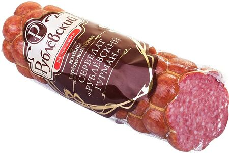 Колбаса Рублевский Гурман сервелат варено-копченый 400г - это визитная карточка московского мясоперерабатывающего завода. Она приготовлена по тщательно разработанному рецепту, имеет характерный красно-розовый срез с мелкими вкраплениями шпика и узнаваемую оболочку с оплеткой. Как и вся продукция МПЗ, колбаса сделана из высококачественного охлажденного мяса, прошедшего контроль на экологическую чистоту, и отборных специй. "Рублевский" занимает премиальный сегмент на рынке и является обладателем 50 золотых и серебряных медалей, полученных на международных выставках. Завод оснащен современным оборудованием, позволяющим сохранить витамины, минералы и белки, содержащиеся в исходных ингредиентах.
